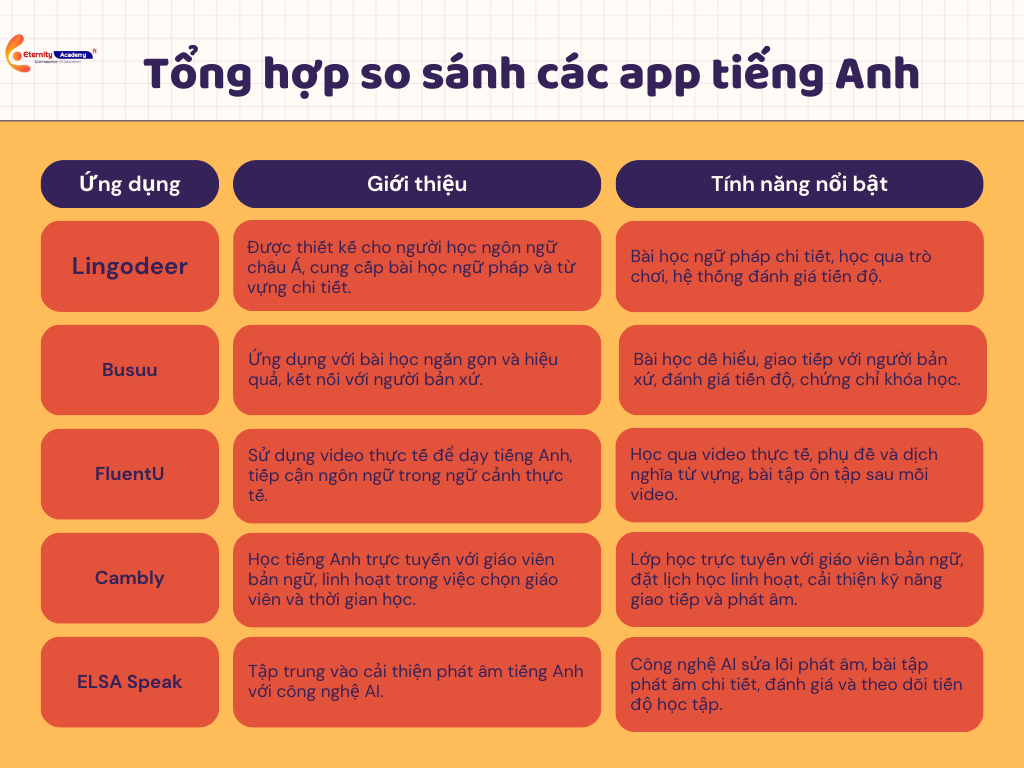 Bảng tổng hợp so sánh giữa các app tiếng Anh